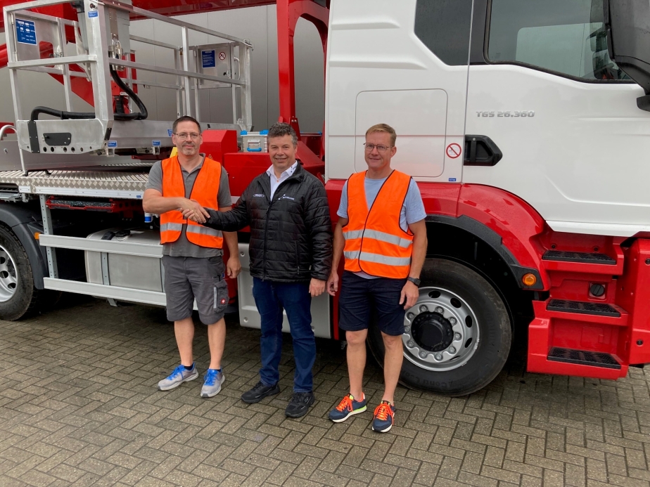 Ludger Rensing (Gebietsverkaufsleiter Süd-West, RUTHMANN) übergibt den neuen STEIGER® T 510 HF an Klaus Butz (links) und Michael Roder (rechts) von der Motz GmbH.