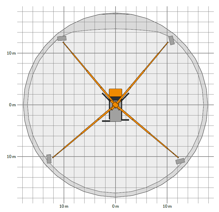 Schmal abgestützt, erreicht er trotzdem bis zu 17 Meter Reichweite bei voller Korblast.