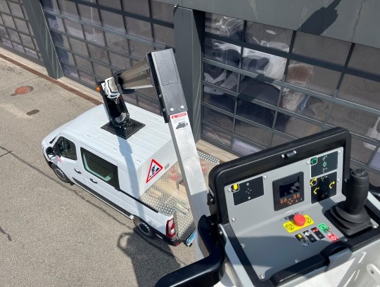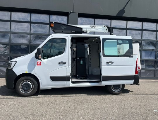 Kompakte und wendige Hubarbeitsbühne mit 11.9 m Arbeitshöhe, 6,7 m seitlicher Reichweite und 120 kg Korblast. Aufgebaut auf einem kurzen 3.1 t Renault Master mit Ausschnitt hinten, (Länge: 5.26 m / Höhe: 2.8 m). Diese Maschine ermöglicht maximale Flexibilität bei beengten Platzverhältnissen. Die Maschine ist extrem wendig und schnell aufgestellt, weil ohne Abstützung. Ideal für vielseitige Einsätze.